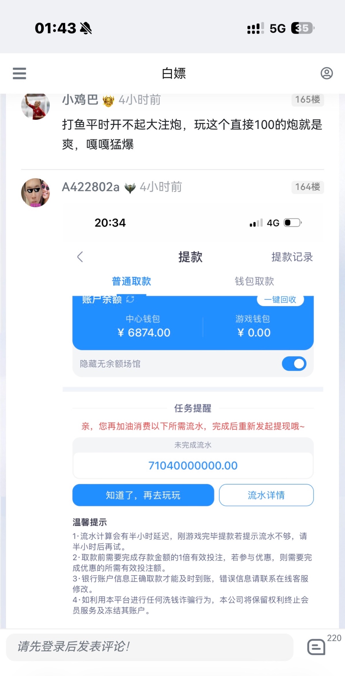 昨晚论坛看到的,总共充了6次以上5600,一晚上干到 6,余额有3000,不想打了,现在提会不会黑