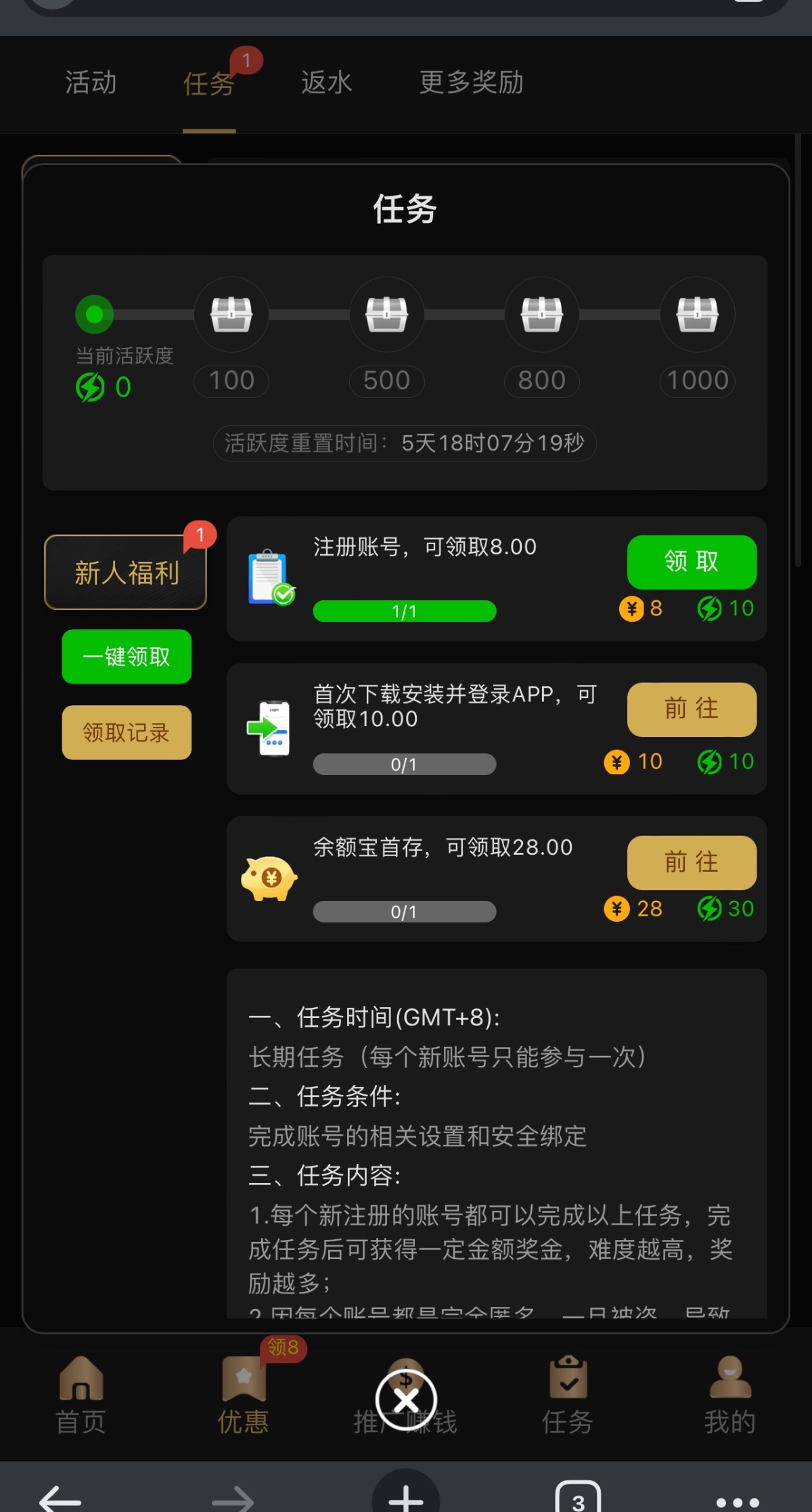 新用户注册任务里面秒领8下载APP登录领10一共18/100提现。冲冲冲人多就黄。