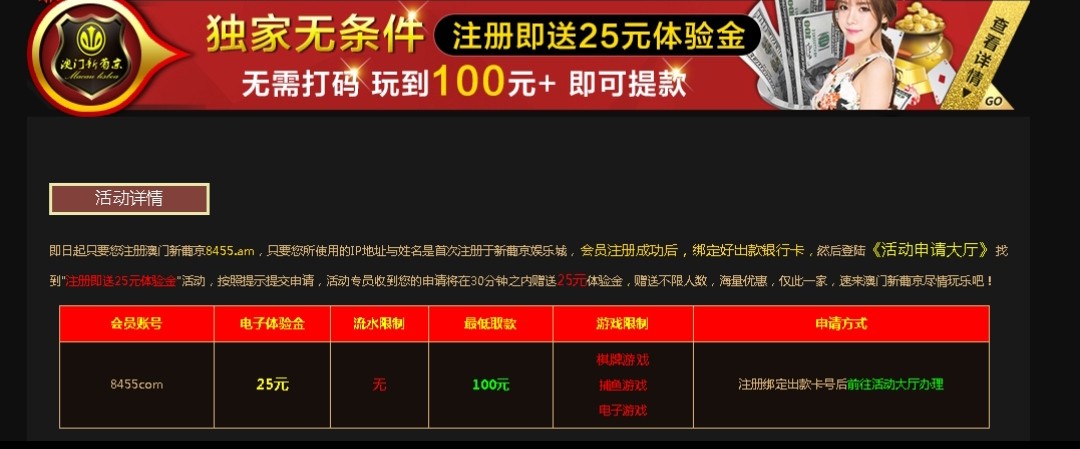 新用户注册完善个人信息绑定平台银行卡前往游戏大厅申请25彩金。
