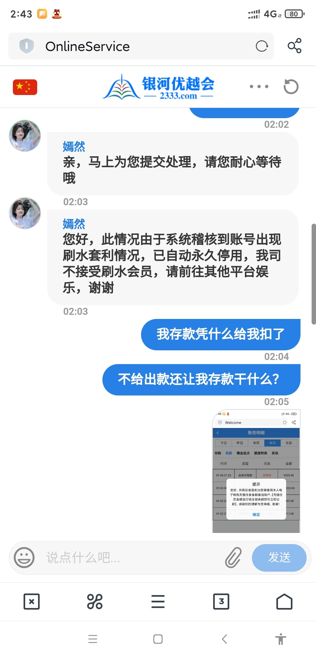 签到金打到出款,提款让充值任意金额,等你存完款再提款就直接清零账号封号了,不存款再去试着提款,他只会给你退回提示你充值,等你冲完值,才会给你清零封号。就是看到有人说出款了,才存了一百试试,结果就被黑了,就玩个麻将胡了,刷水刷它码。
