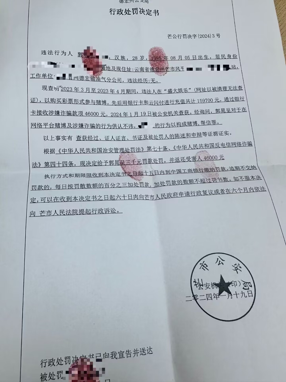 按赌博罚的3000+退46000