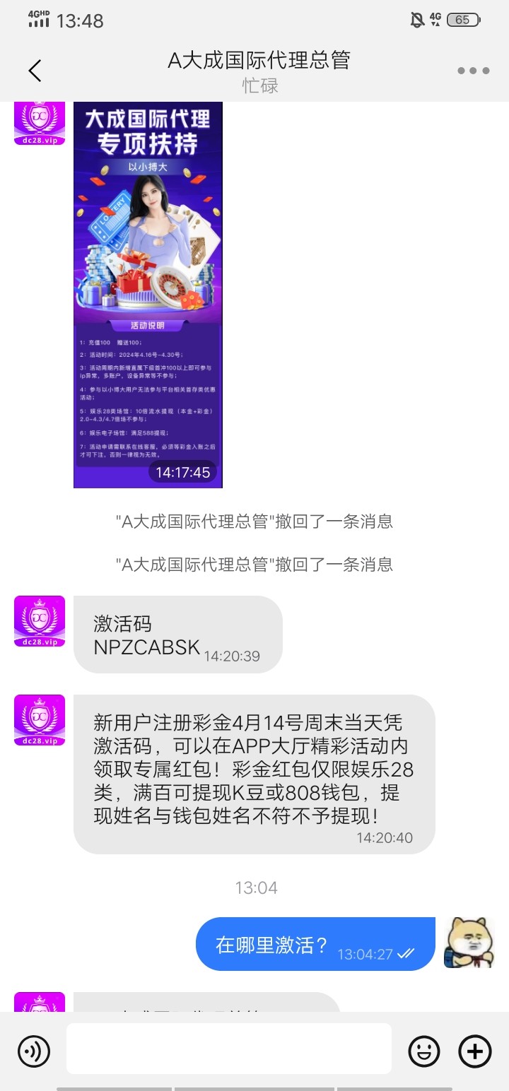 我注册送了 提了100到了 用k豆钱包和808钱包 28要打三倍流水 旺旺管理 544717158