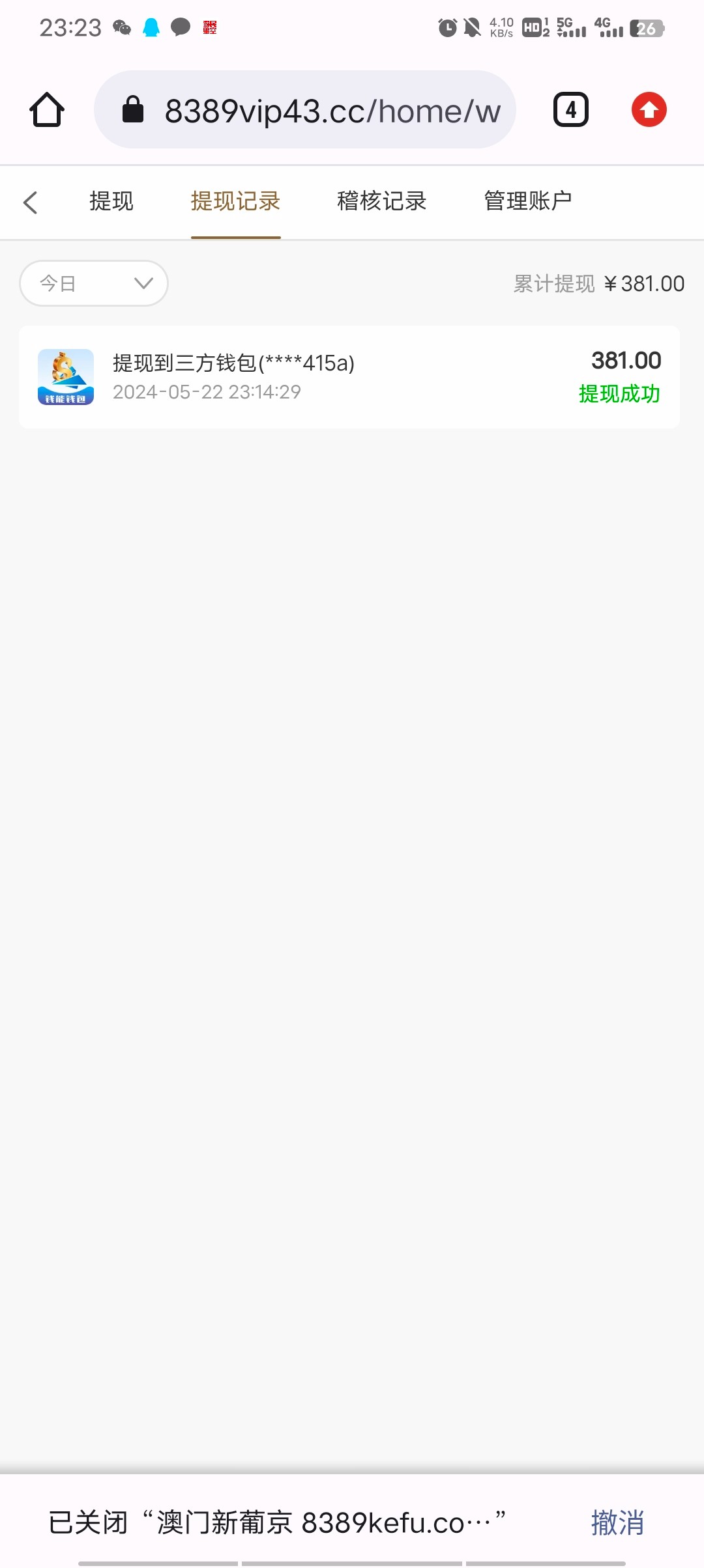昨天玩的,36打到277,说我在他们公司其它平台有账号只让提200。后面77让充100打8倍水,搜帖子看见好像充值会黑,要一直打流水就没管。刚刚去77一直买赏金对决,爆到400多,充了100一直买到1000,提现半个小时没到以为会黑。结果给出了。。