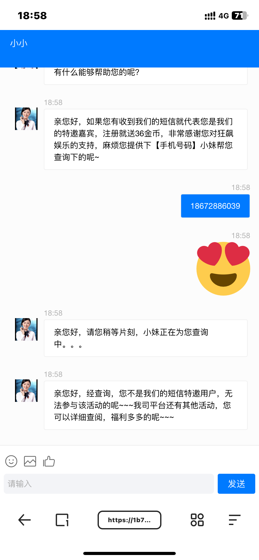 真是见你妈逼鬼了。换了三个客服要来了一个手机号,就他妈没影了,杳无音讯,时辰打开你mlgb。