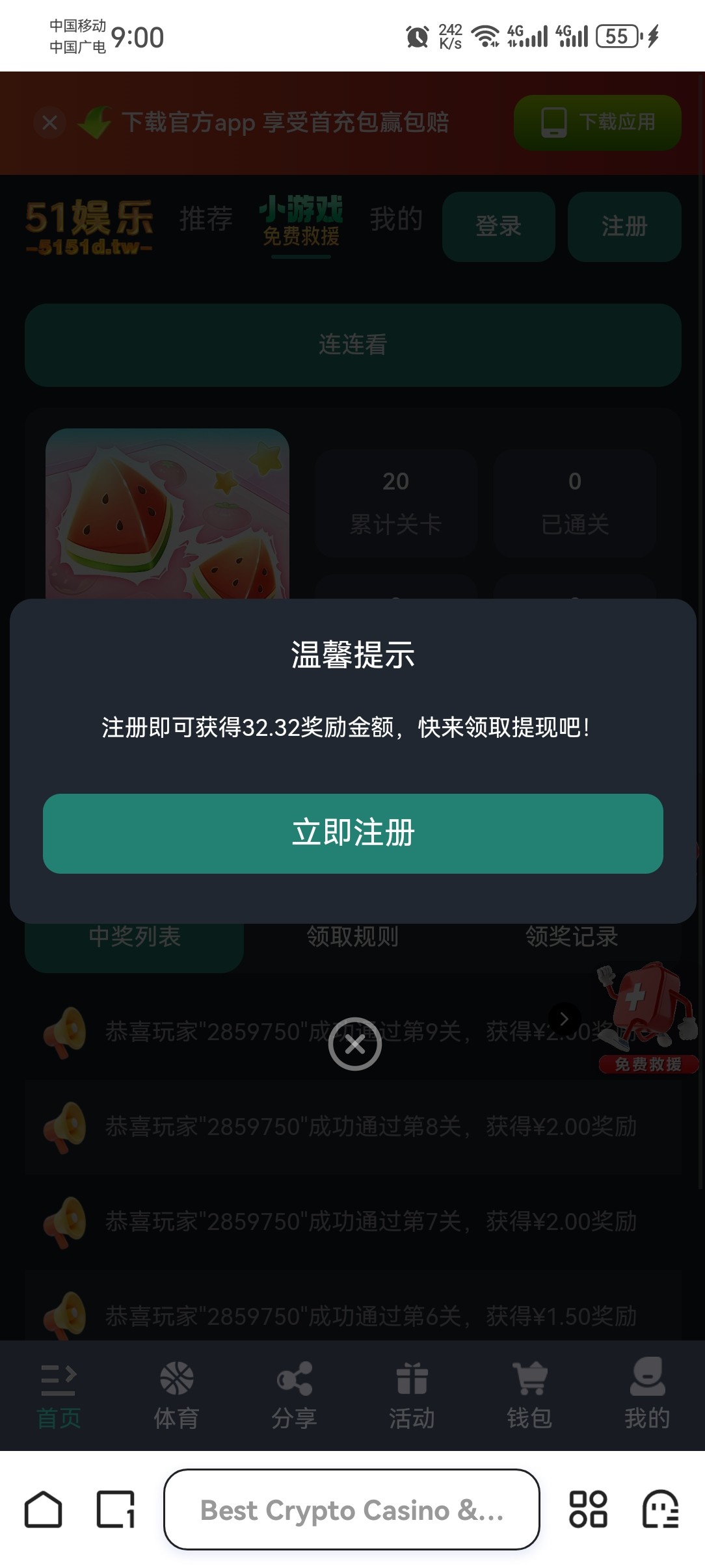 置顶评论 点:注册下载 就能打开网站,自己斟酌撸款白嫖,我打了20几个号,出了一个1200一个600,清除浏览器数据换ip重新撸,点签到宝箱没提示“ip已签到”就能继续干,还有出款不要出同名,找朋友拿支付下