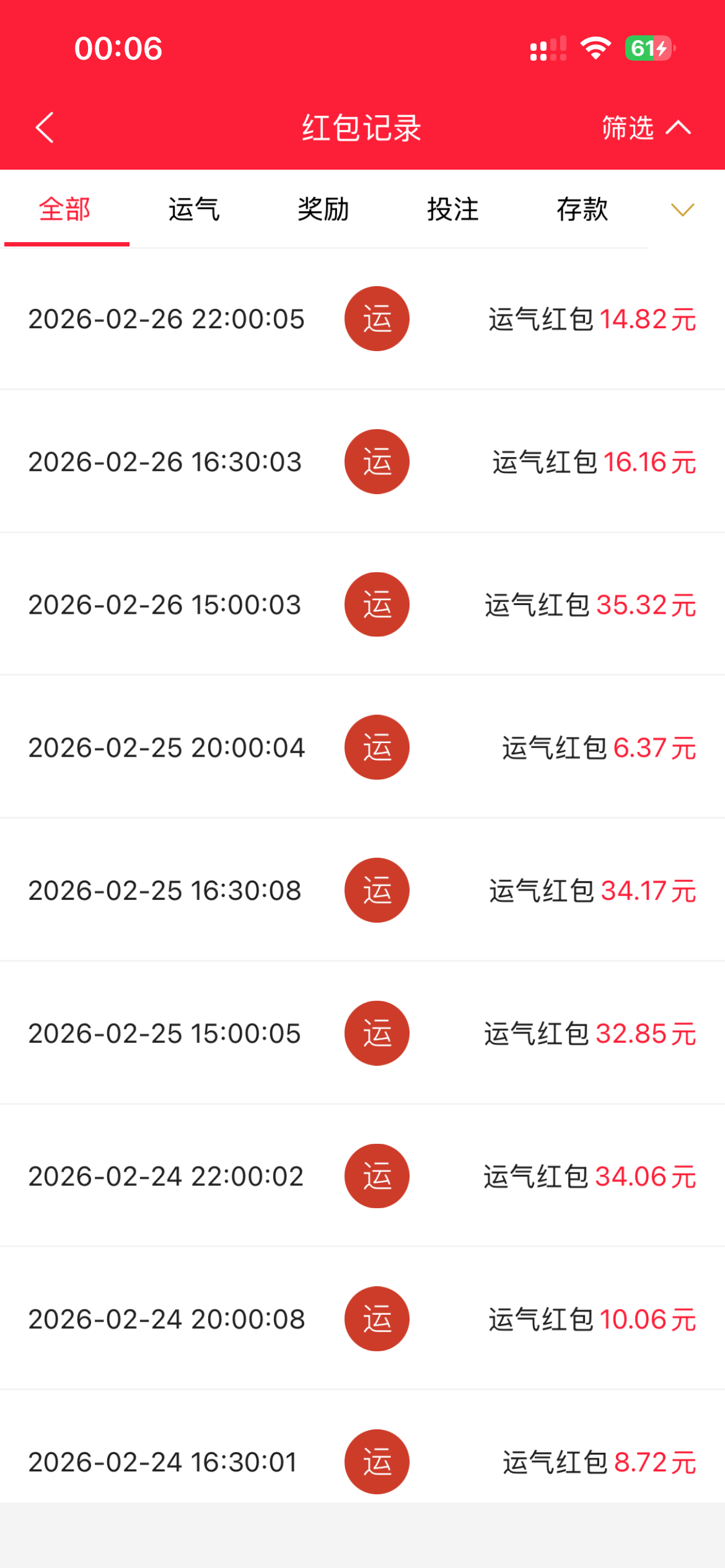 呵呵说春节每天3波红包,2月16到3月3号刚开始红包还能7/8/10彩金,后面一天比一天少了,现在还没资格参与,一直抢点太多频繁 ,有些抢到了提现还说是套利。,011这杂种一次没提现出过50都打不到。