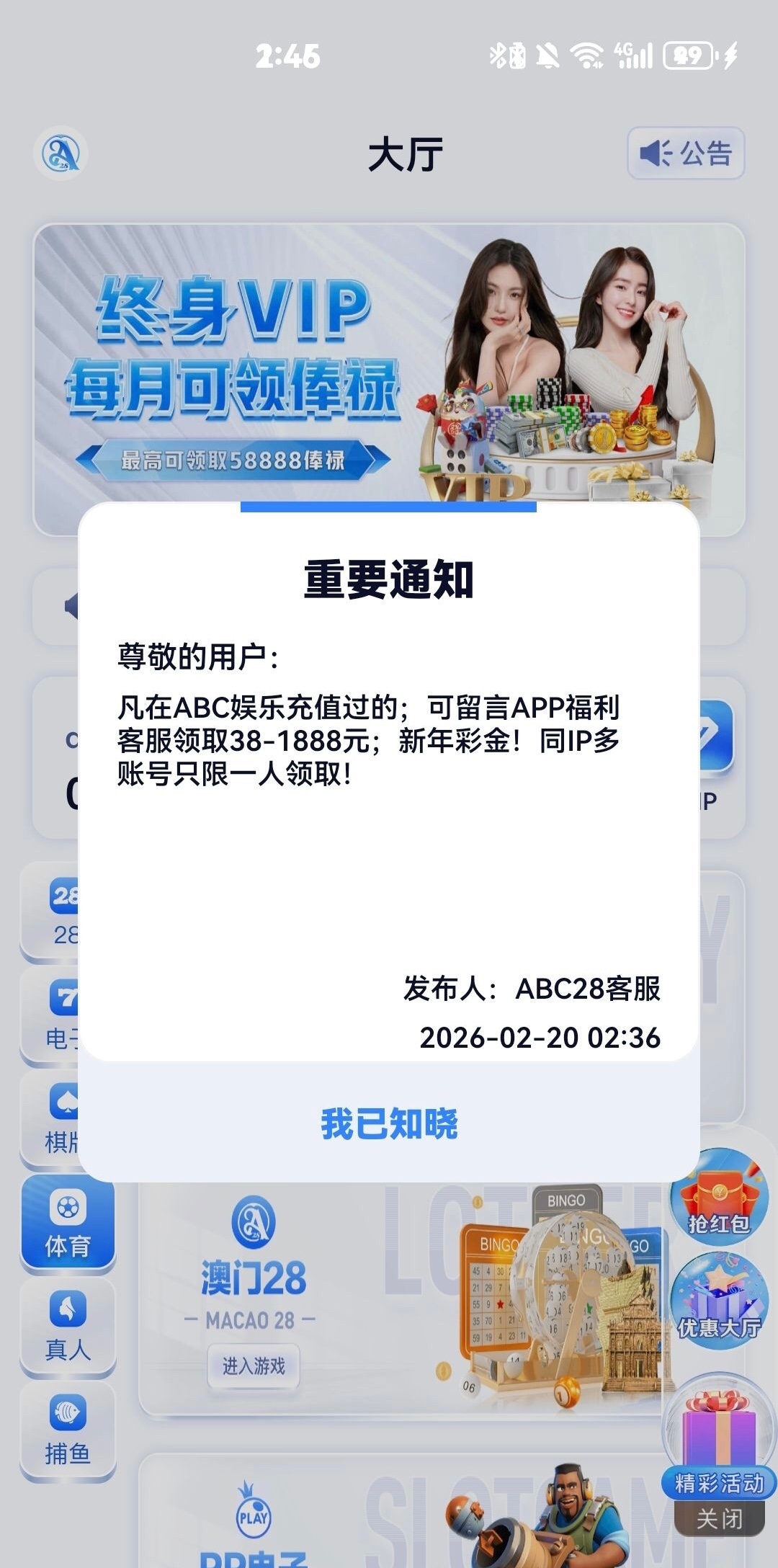 上个月19号领了58,今天月礼金上号看见公告联系福利客服又领了38 链接 abc28.xyz