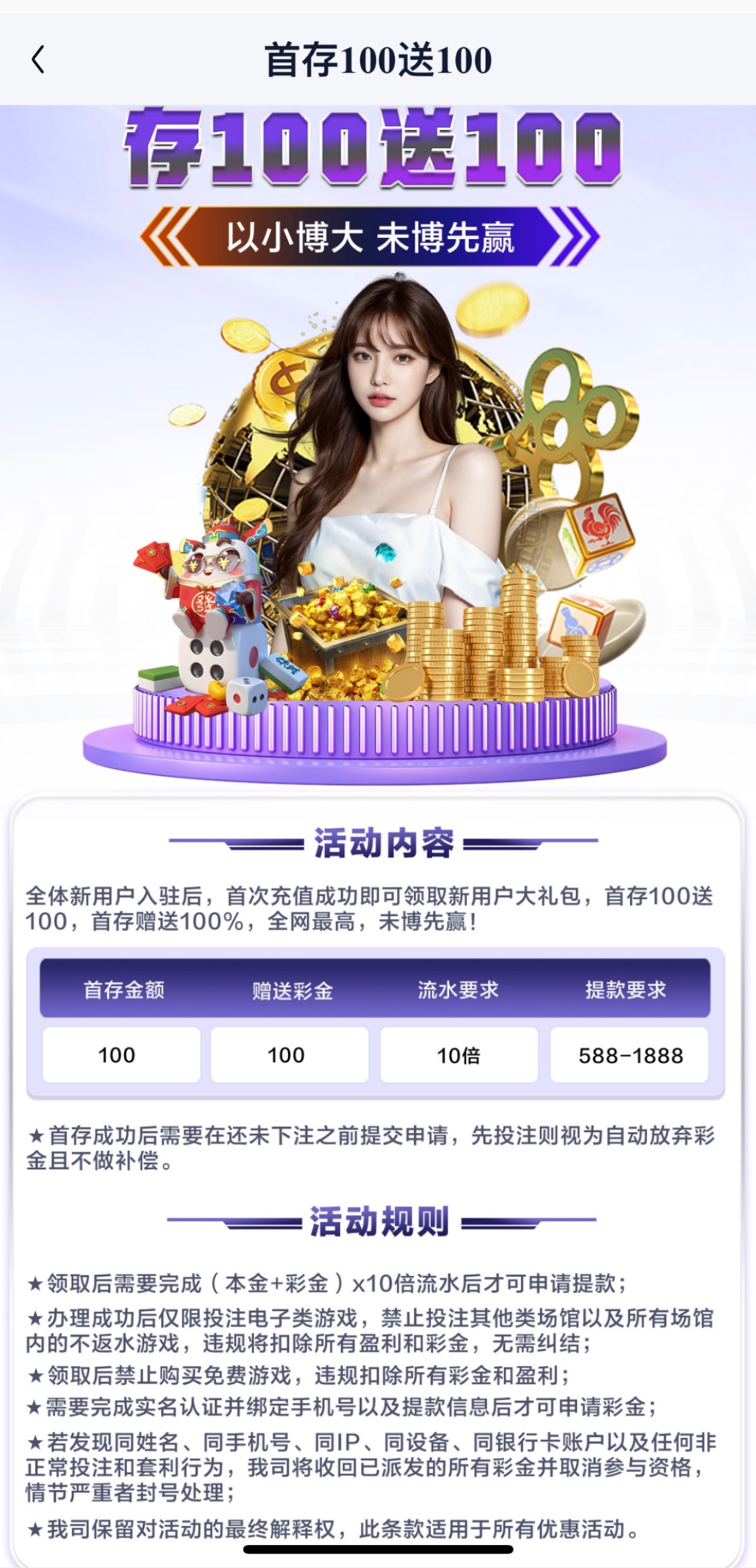 提现条件:完成本金+彩金共10倍流水最低588提现最高提1888