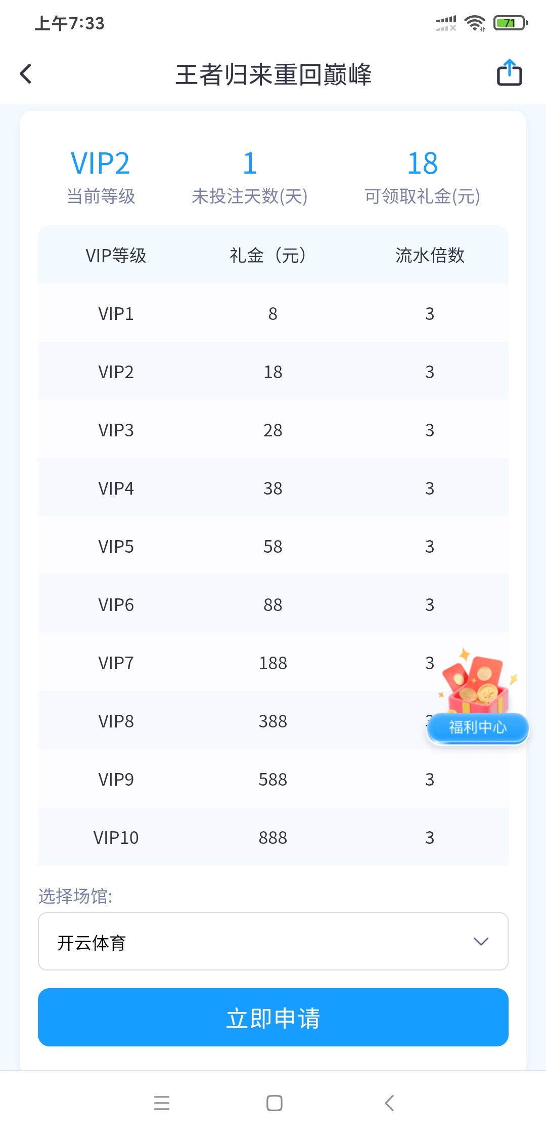 要求有号V1以上,15天以上没玩,优惠活动里王者回归自助领取,3倍流水可提,有号的都上去看看。